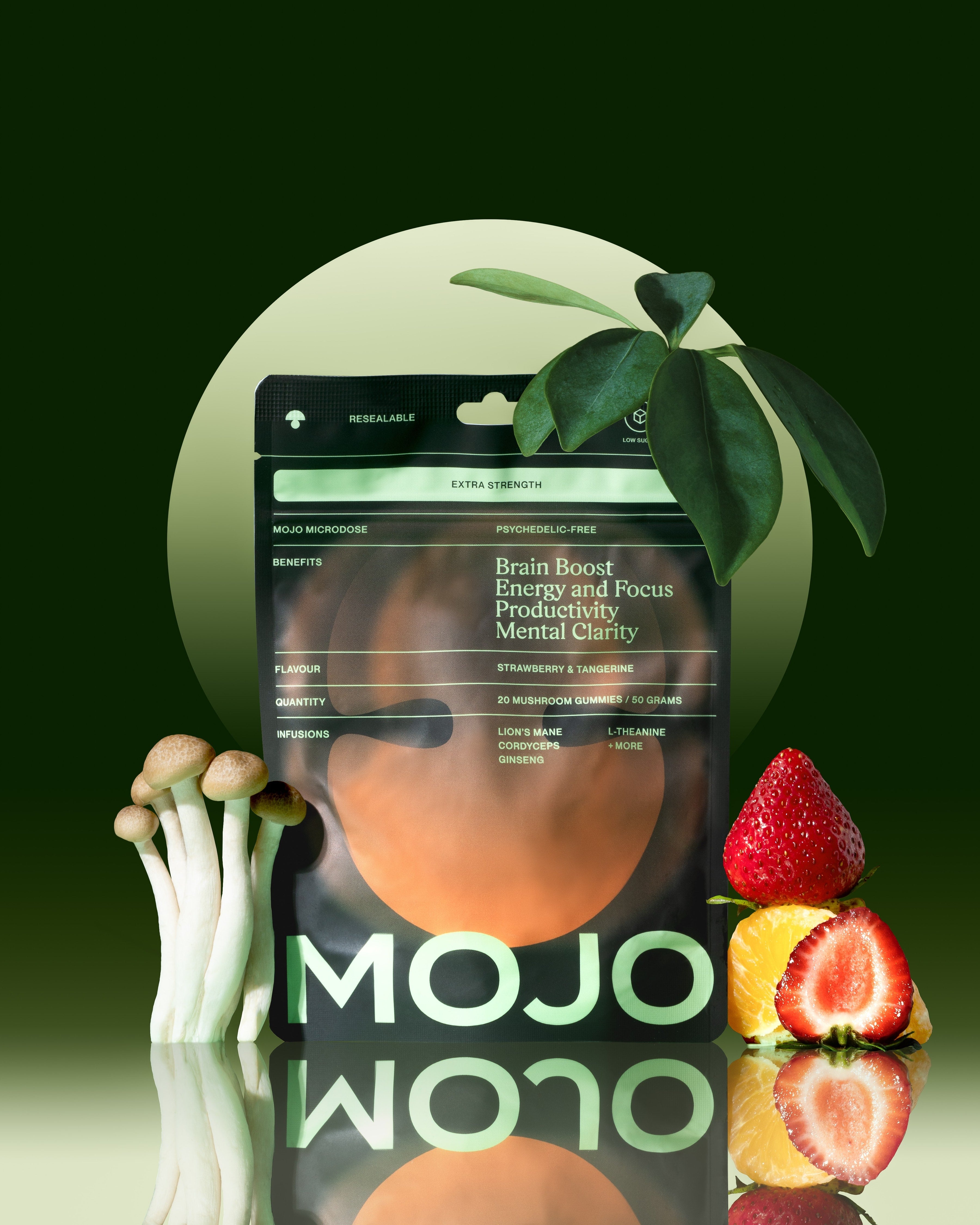 Mojo is designed to induce a flow state similar to a microdose. Through a combined intended sensation of elevated mood, increased focus, a sense of mental clarity, motivation, calm and a subtle energizing effect without the jitters or crash of other products!